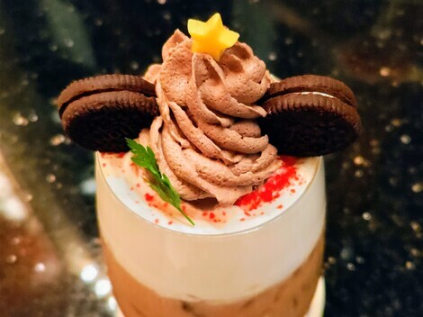 オリジナルカクテルは、チョコレートリキュールとミルクがベース。チョコレートアイスやチョコレートソース、それにイチゴなどが乗っています🍓🍫