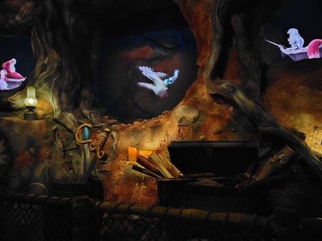シングルライダーで乗ると、プレショーのお部屋の一番前の柵よりも前(柵とスクリーンの間)に案内され、柵ごしの撮影になりがちな剣や宝箱も障害物なしに撮影することができました!!