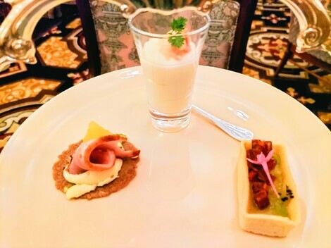 上から時計回りに、「ホワイトアスパラガスのムース」「キウイとクランベリーのタルトレット イベリコチョリソーのアクセント」「鴨肉とオレンジクリームのカナッペ」です。