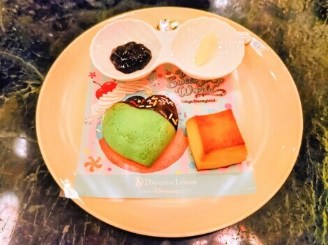 左が「ディズニー・パルパルーザ“ヴァネロペのスウィーツ・ポップ・ワールド”スペシャルセット」のスコーン&ブレッド(オリジナルプレーンスコーン、ピスタチオブレッド)🫓