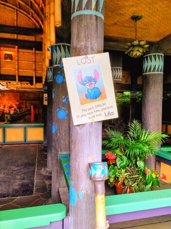 「魅惑のチキルーム」で、迷子になったスティッチの足跡を入口からずっと追いかけて行くと、劇場内に潜り込んでしまったらしい、スティッチが開けたと思われる穴に行き着きました🕳️🐾