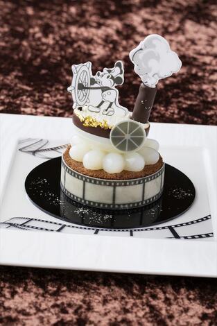 今日からアンバサダーホテルの「ハイピリオン・ラウンジ」で、『蒸気船ウィリー』がモチーフの「ラズベリーガナッシュ入りチョコレートケーキと柚子とオレンジのムース」(ハイピリオン・ケーキセットシリーズ)が頂けます☆