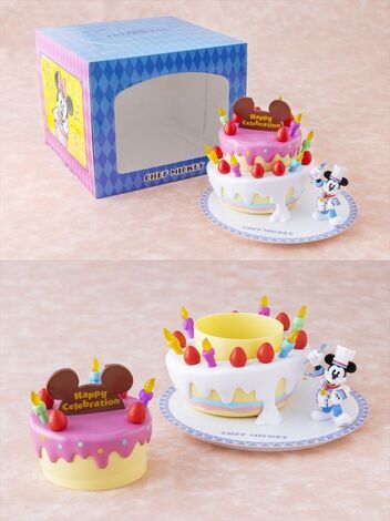 お皿の上にはシェフ姿のミッキーと、カラフルな2段デコレーションケーキ。ケーキの上には更に、ミッキーのイヤーハット型メッセージチョコレートプレート🐭🍫
