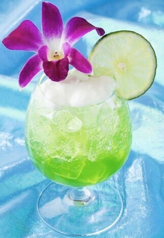 ヨーグルトドリンク、クランベリージュース、グリーンジュレ、アマレットシロップ、ブルーシロップ、アイスジャスミンティー、ミルクが入っています。