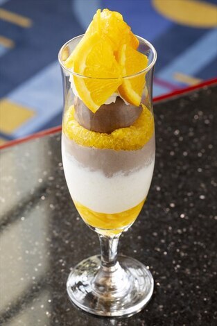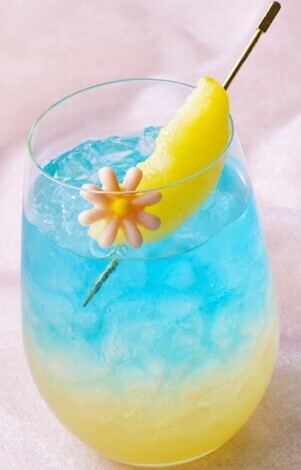 アンバサダーホテルの「ハイピリオン・ラウンジ」で4月8日から注文できる、「東京ディズニーシー25周年“スパークリング・ジュビリー”スウィーツドリンク」です。