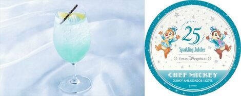アンバサダーホテルの「シェフ・ミッキー」で4月8日から注文できる、「東京ディズニーシー25周年“スパークリング・ジュビリー”スペシャルドリンク」です。