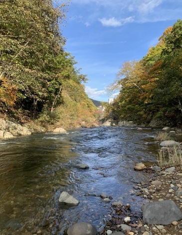 川が透明で、夕方近くですが空が青くて空気が澄んでいました。