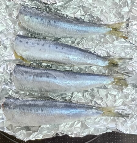 塩焼きです。今日は鰯をオープントースターで焼きます。アッ塩かけるの忘れた