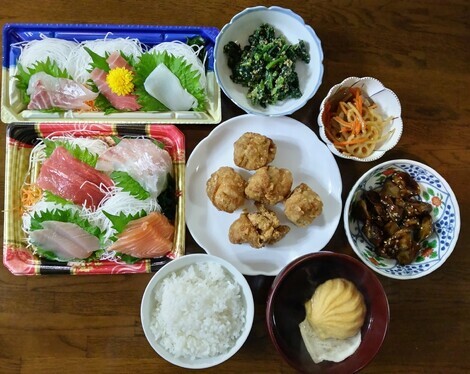 刺身盛り合わせ、唐揚げ、ほうれん草の胡麻和えなどを食べました