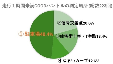 右左折の際、事前に20km/h 程度まで減速してから5秒以上かけて曲がった場合や、車線変更の際に3秒以上かけて滑らかに車線を移った場合などに、「GOODハンドル」と判定します。
