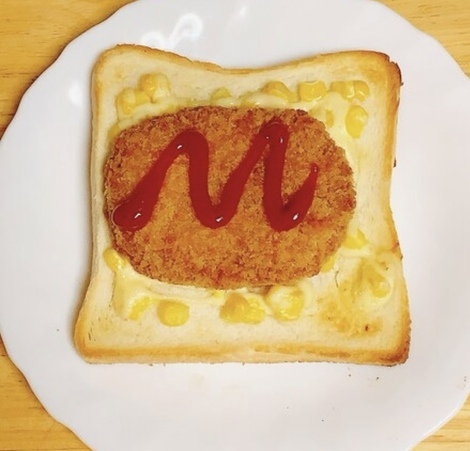 食パンにマヨネーズ、コーンを乗せ、コロッケを置きます。