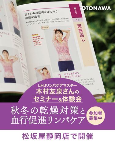 11月14日(木)、松坂屋静岡店で開催する 【秋冬の乾燥対策と血行促進リンパケア セミナー&体験会】では、 薬剤師でリンパケアマスターの木村友泉さんをお迎えし、 ご自宅でもできる「むくみ・冷えの改善ケア」を実践的に学べます。
