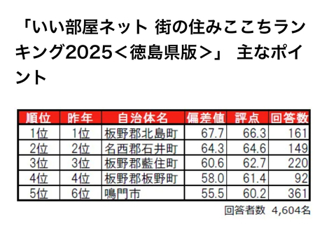 夏に、大東建託が居住満足度調査を行い、住みここちランキングを発表していましたが、徳島県内に住まれている皆さんは、どこだと思いますか?