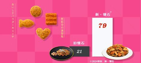 うまみパウダー従来比(2024年秋 リニューアル前)150%に増量し、より美味しさキャッチしやすい波型粒を新配合することでおいしさアップ!