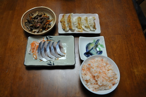 昨日のハンバーグが残っていますが二日続けては、如何なものかあっさりとしたものを・・・何を作りましょうか思案中、刺身もあるし解凍すればすぐ食べられる、疲れたから簡単に済ませよう。