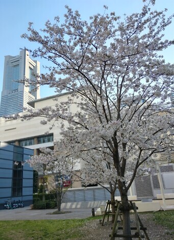青空に桜🌸綺麗ですね(〃∇〃)わたしも昨日桜木町行きましたが、雨と風でかなり散っていました…
